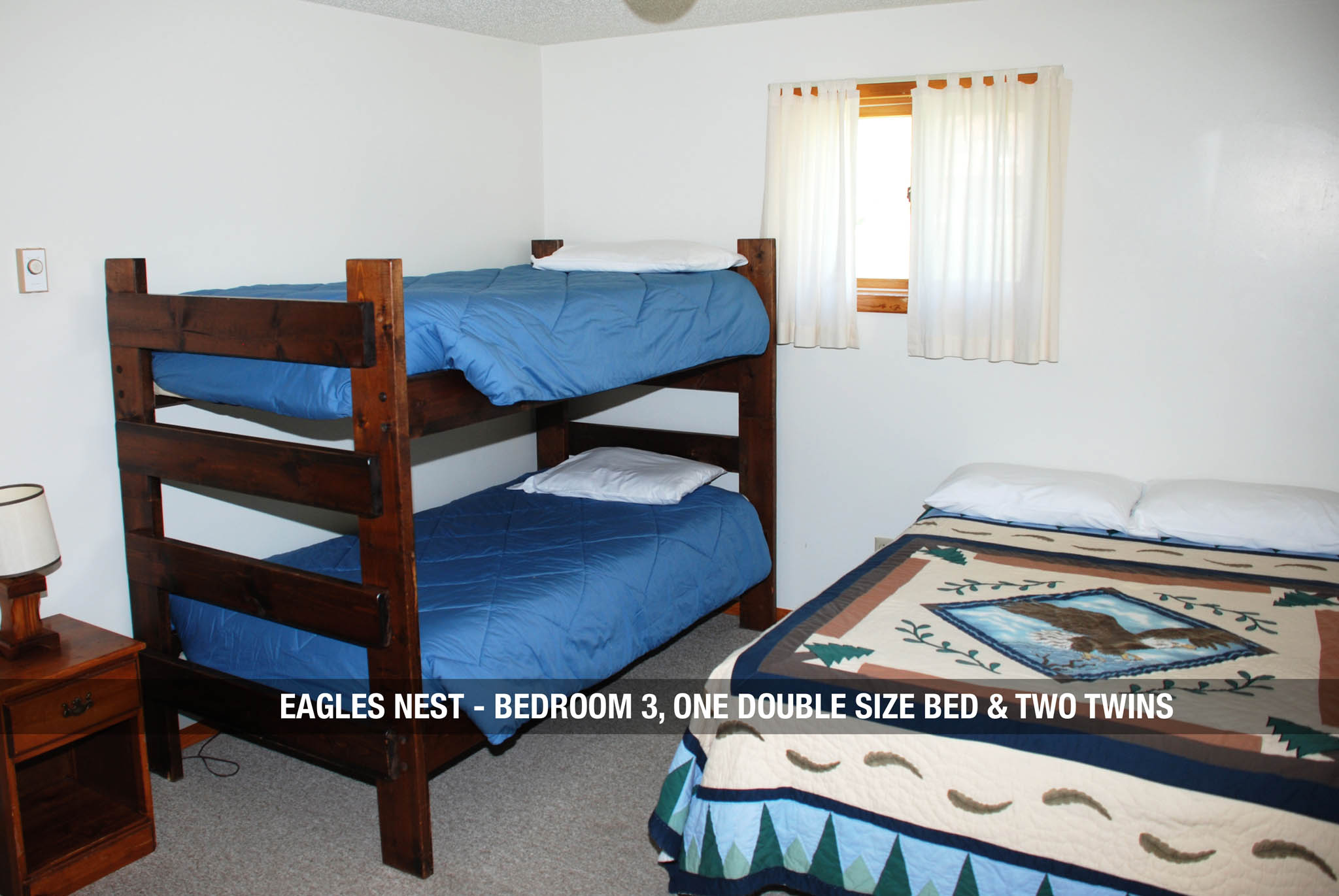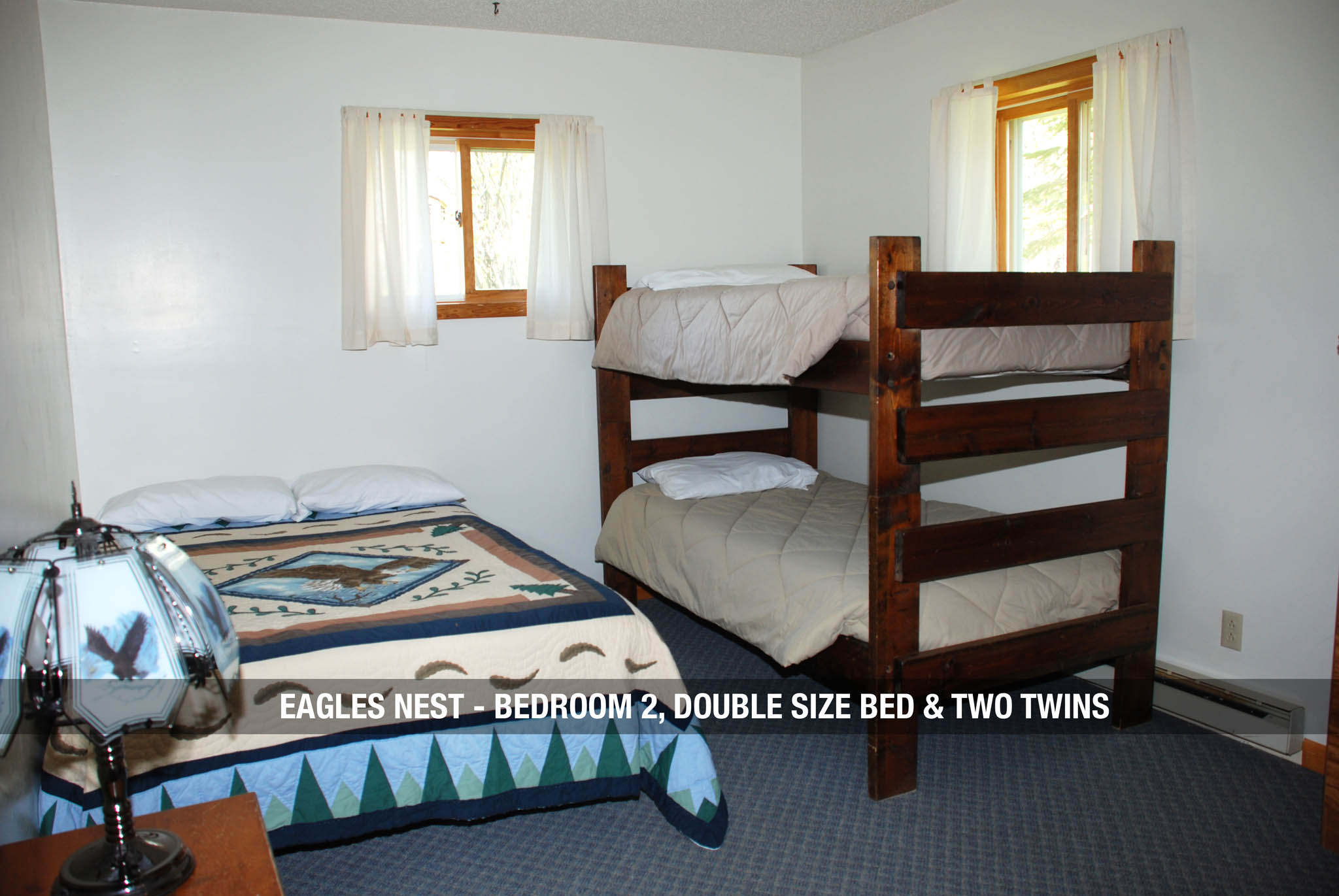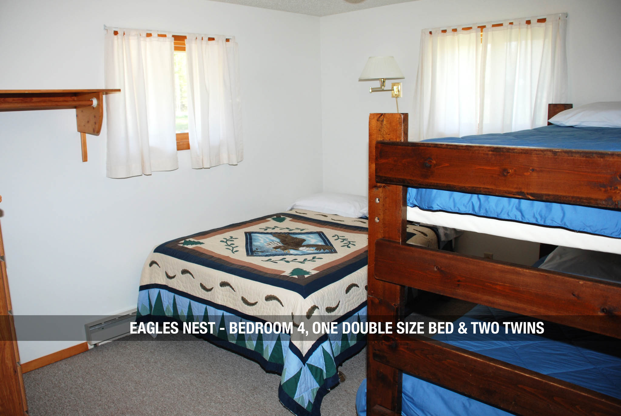 4 bedrooms, 2.5 bathrooms, vaulted ceiling, dining area, free standing fireplace and a large wrap around deck. Each bedroom has one double bed and a twin bunk. Great for a large family or group.