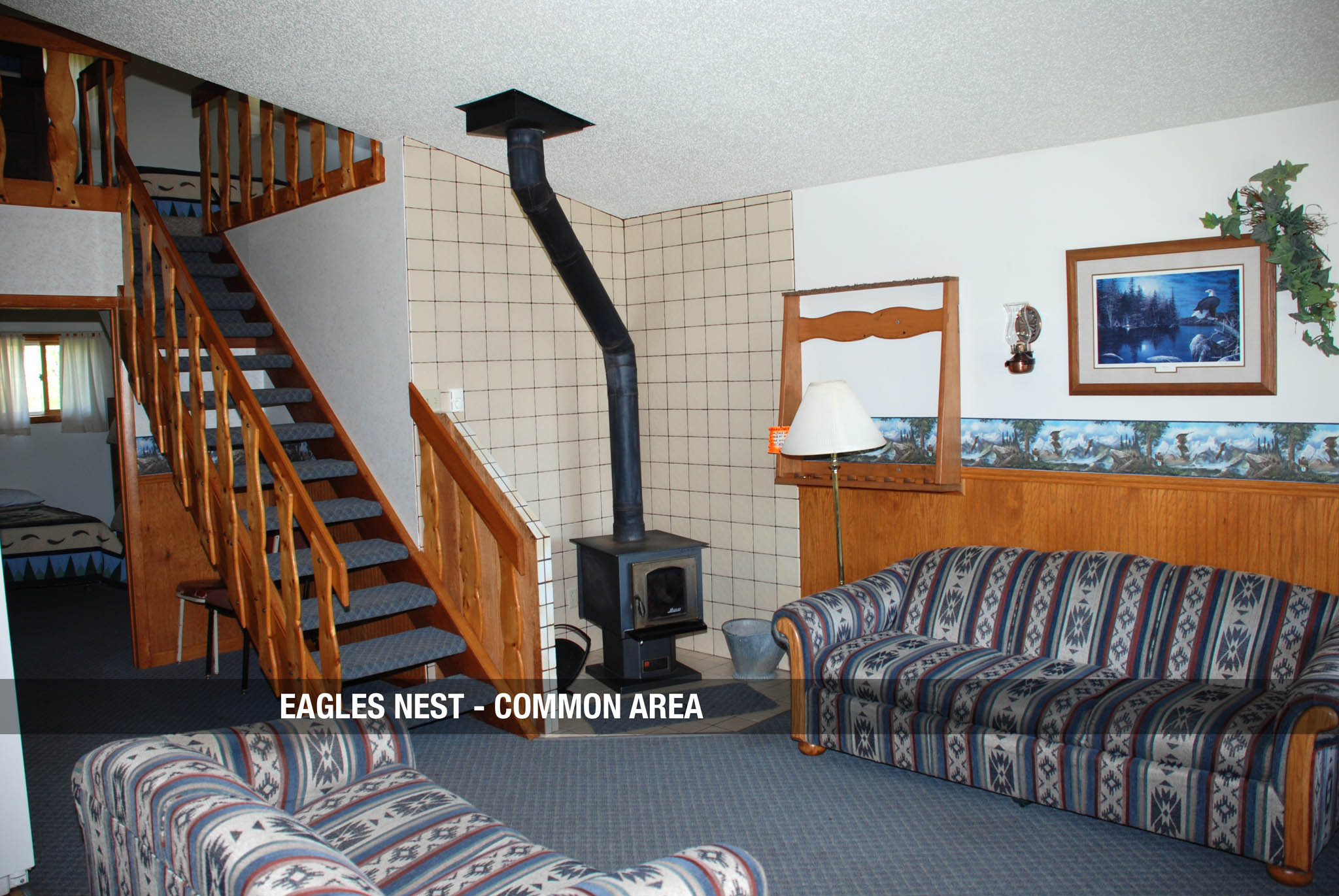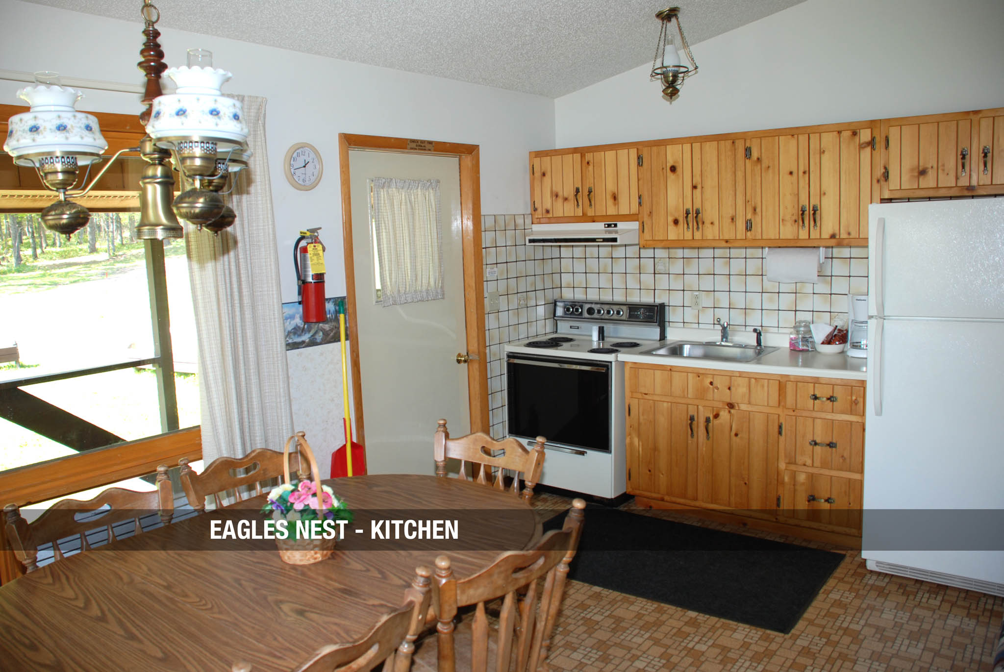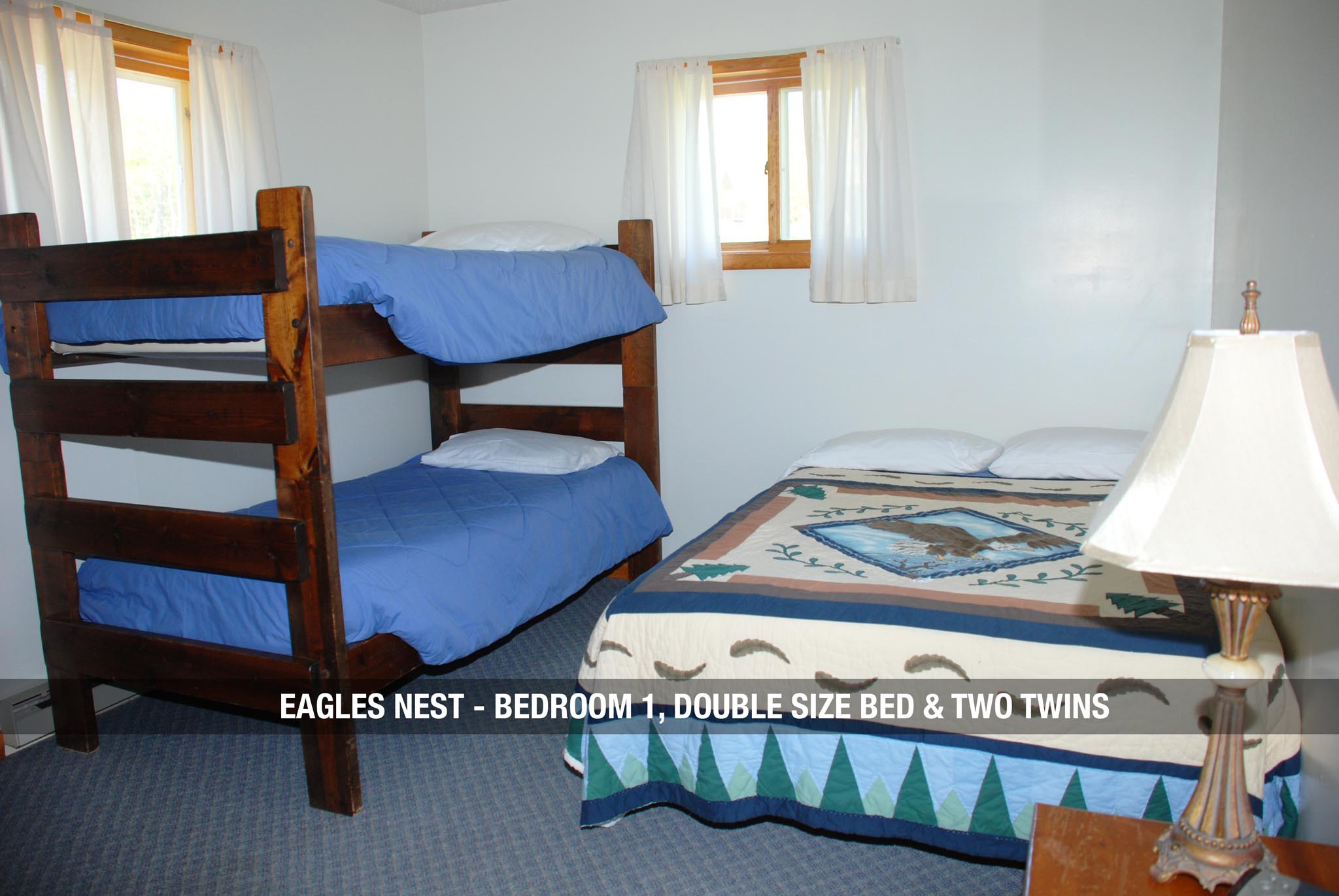 4 bedrooms, 2.5 bathrooms, vaulted ceiling, dining area, free standing fireplace and a large wrap around deck. Each bedroom has one double bed and a twin bunk. Great for a large family or group.