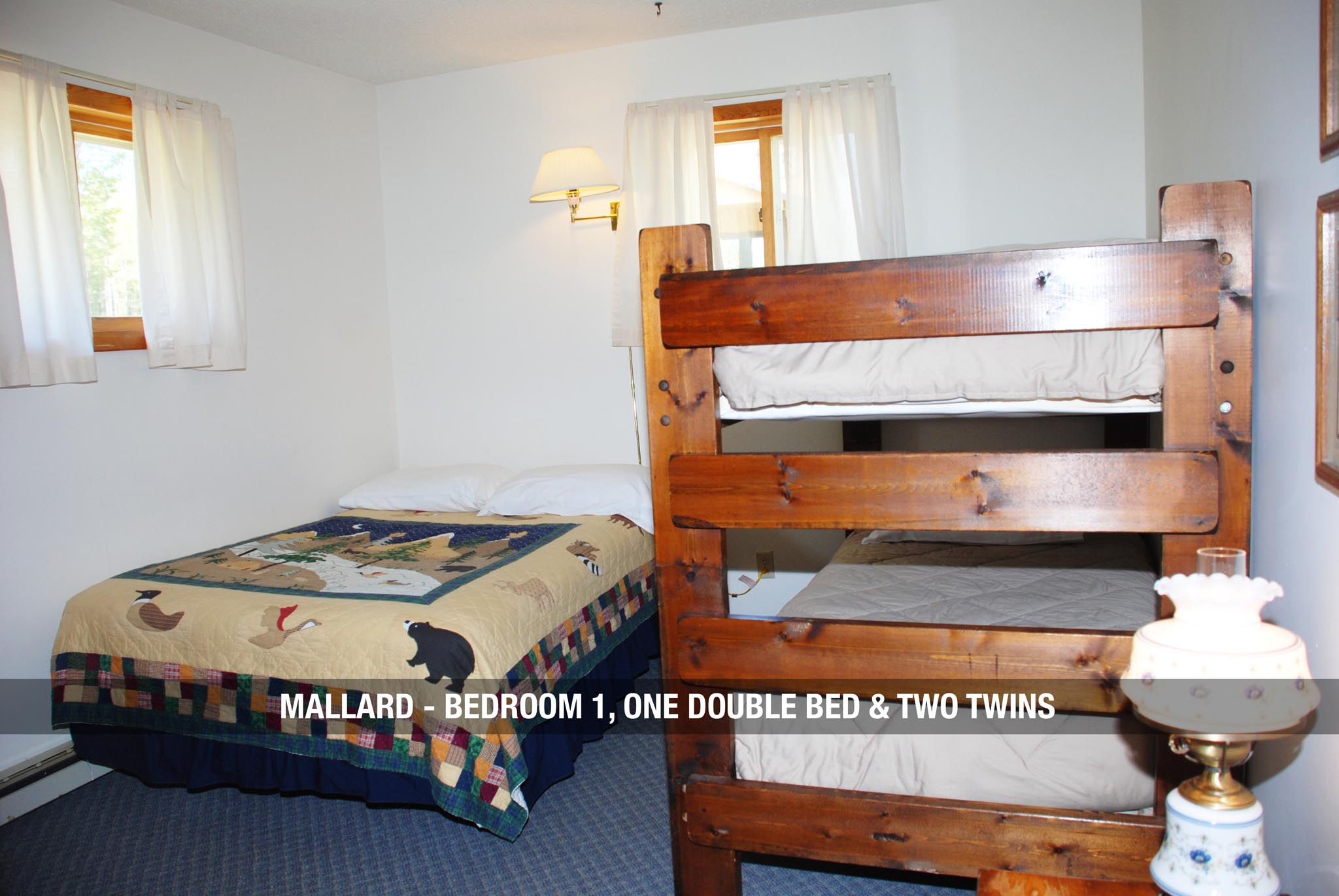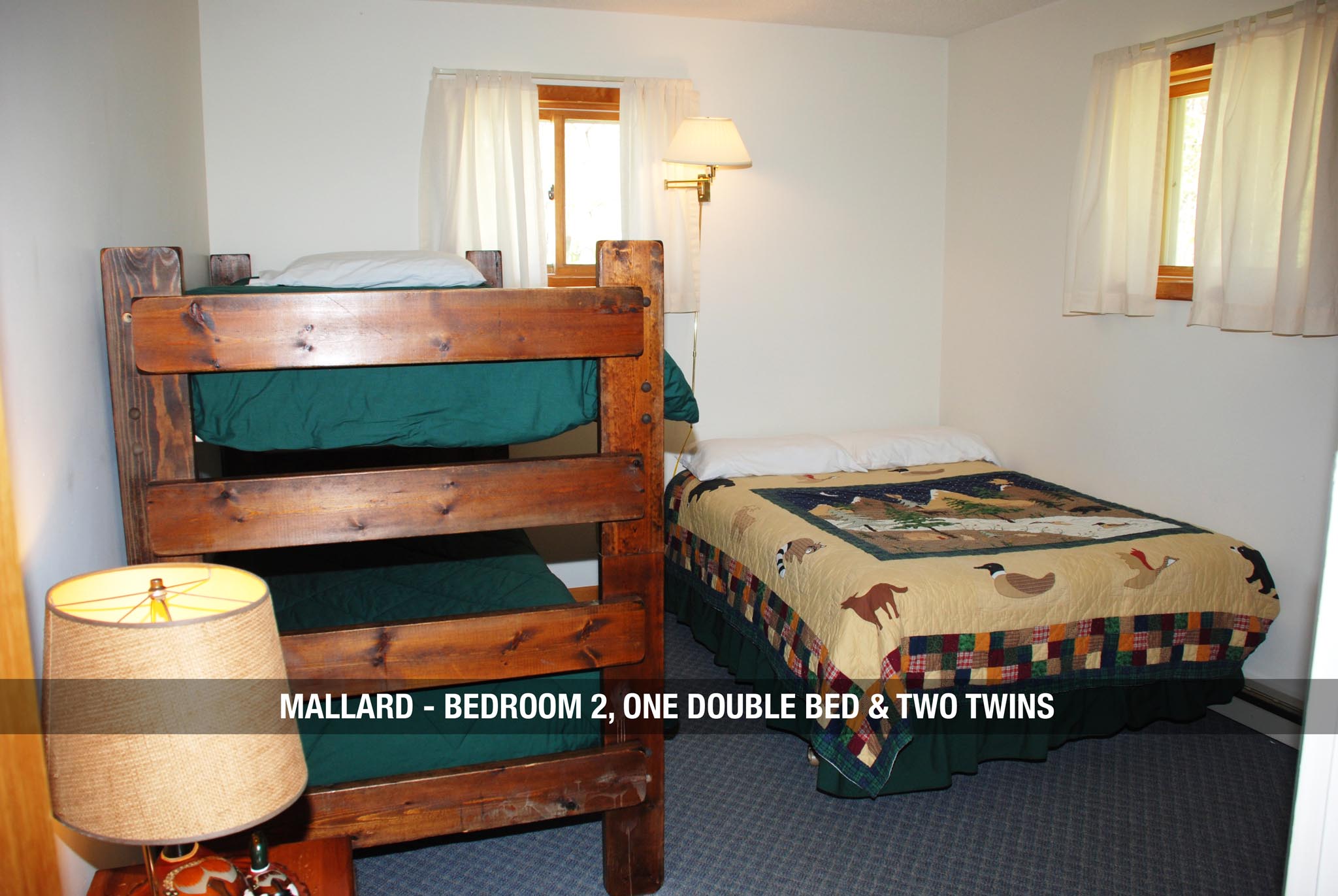 2 bedrooms, 2 bathrooms, vaulted ceiling, dining area, free standing fireplace and a wrap around deck. Each bedroom has a double with a twin bunk.