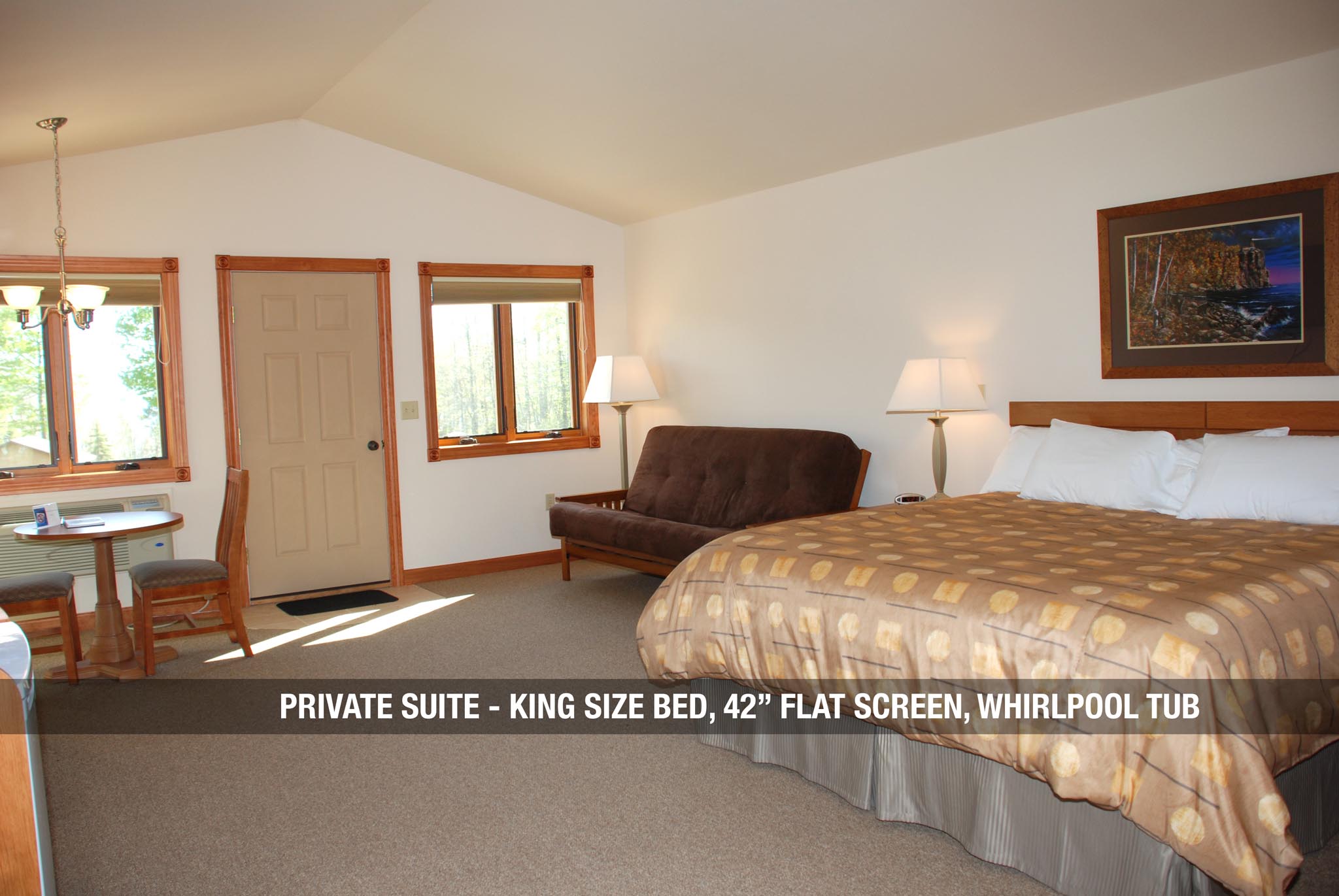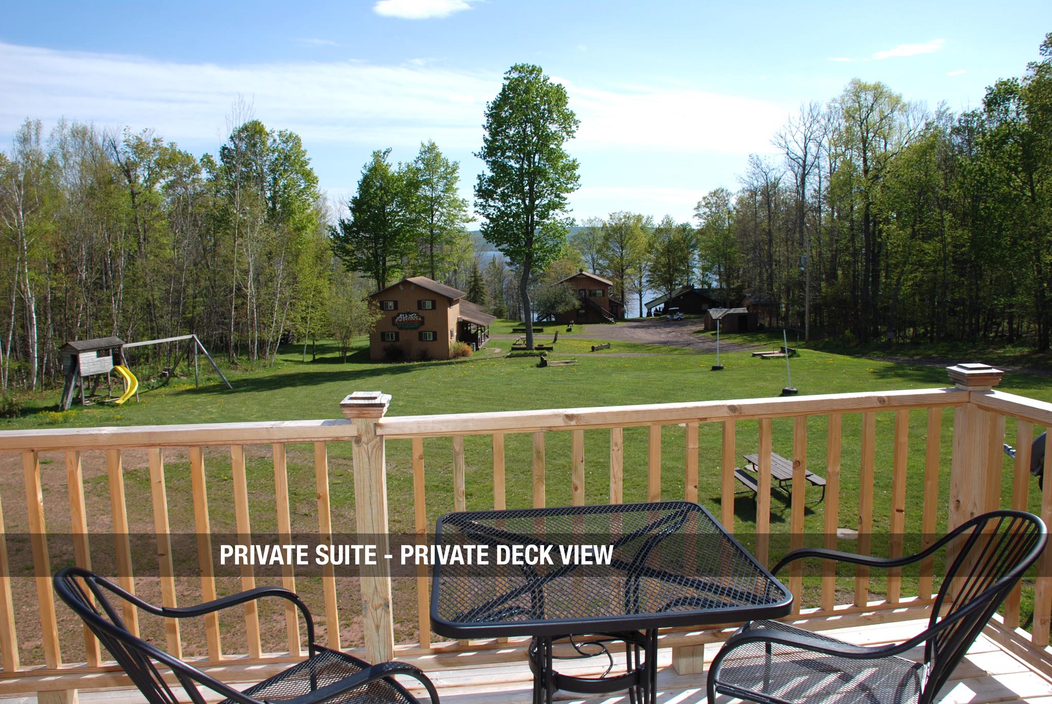 flat screen TV. Our Private Suite offers a private deck that faces the lake and also includes a futon, microwave, small refrigerator and a table with four chairs.